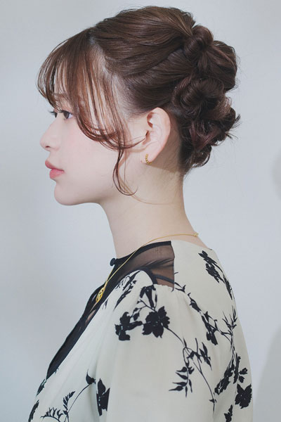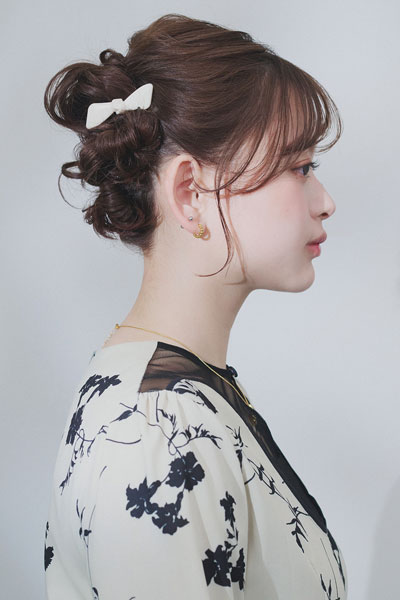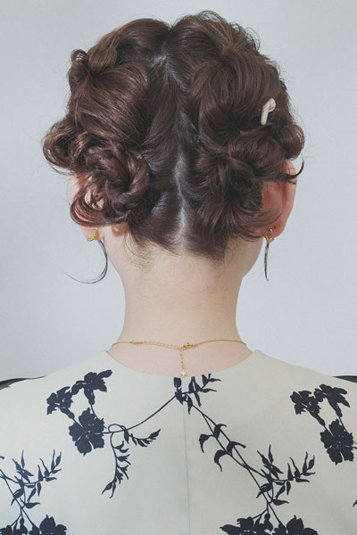 人と被りづらいツイン要素を取り入れ、フルアップにまとめてフォーマル感を演出。正面から見たときにもかわいく見えるよう、バランスを見て引き出したりハネさせたり、シニヨンをゆるくくずすのがポイント。気になる部分をふわっとさせれば、骨格調整も可能。ふだん、フェミニンな格好をしない人でも幅広く挑戦しやすい、お呼ばれスタイルへ。