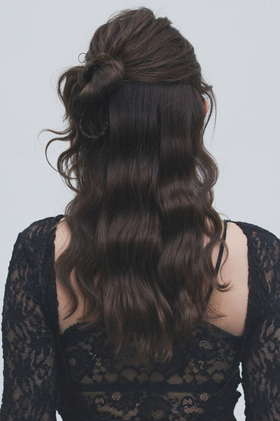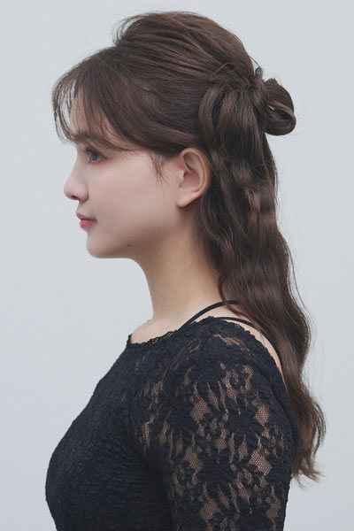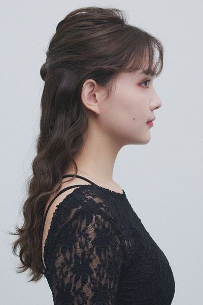 街では、「かっちり」と「ゆるふわ」の間がトレンド。今回はディナーデートをイメージし、曲線を意識した女性らしいシルエットに。ベースの巻きに細い巻きをプラスすることで、ランダムなリッジを表現。正面から見ても華やかに見えるようサイドにまとめたシニヨンは、ふわふわにしすぎずツヤをまとわせ、毛先を遊ばせてメリハリを出して。