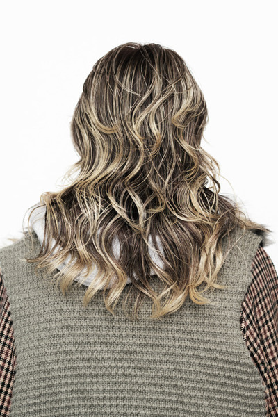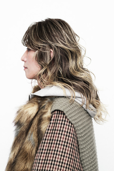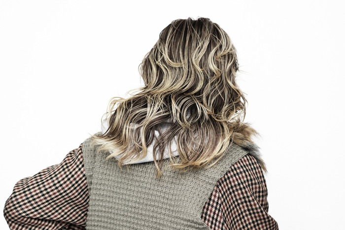 COLOR/全体を弱めのブリーチで10トーンまで上げる。ハイトーン部分をレイヤーに合わせて引きだしてエアタッチし、2回に分けてブリーチで18.5トーンまで上げる。ベースはブロンドを塗布。その後、イエロー(「塩基性カラー」イエロー 5%/キラテラ)を混ぜたシャンプーで洗髪。ローライトはアッシュベージュを塗布。