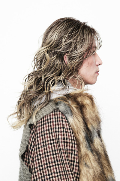 ブロンドとベージュの繊細なコントラストが絶妙な、ヨーロッパスタイルのバレイヤージュ。透明感を出すため、ベースも弱めのブリーチで10トーンまでリフトアップしてからオンカラーするなど細部にまでこだわった。model: Fujiwara Ryota