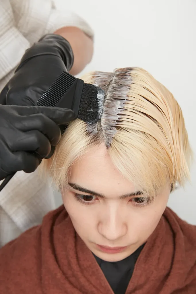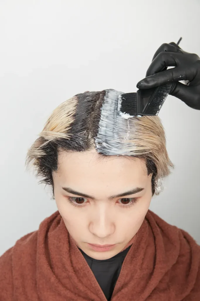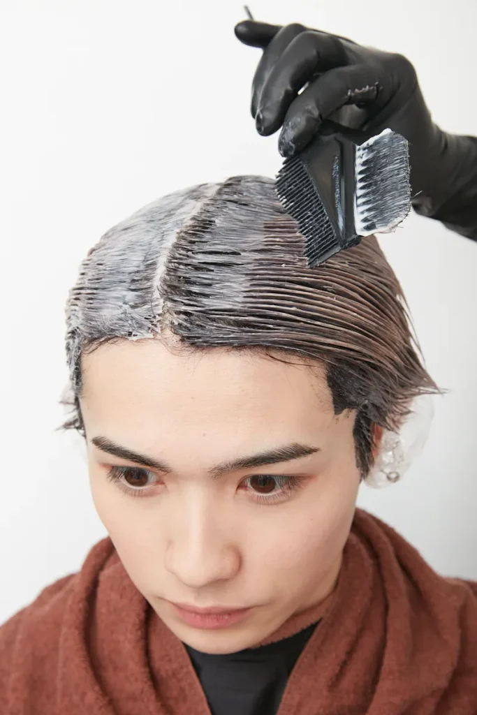 毛先を塗布。根元〜毛先までスピーディに一気に塗ったら、自然放置3分で流す。