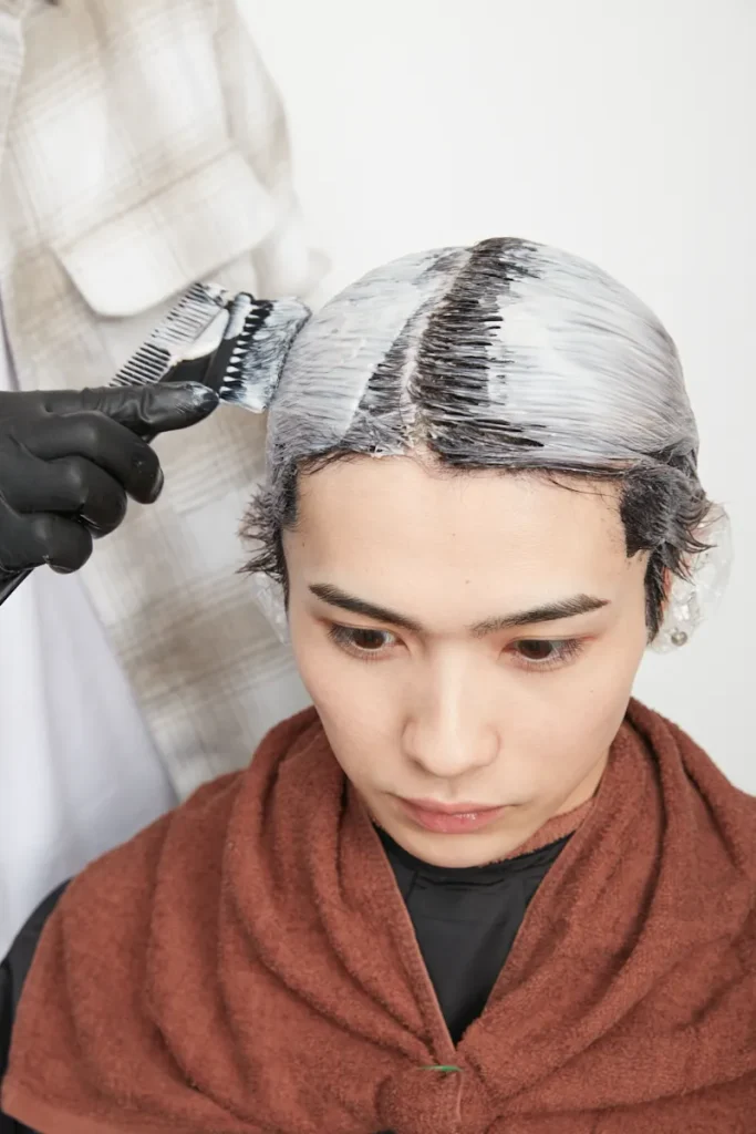 根元〜毛先に向かって明るくなるシャドウルーツが今回のカラーテーマ。まず根元のリタッチ部分から塗布。自然放置10分で中間を塗る。