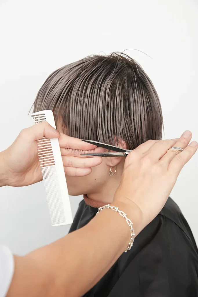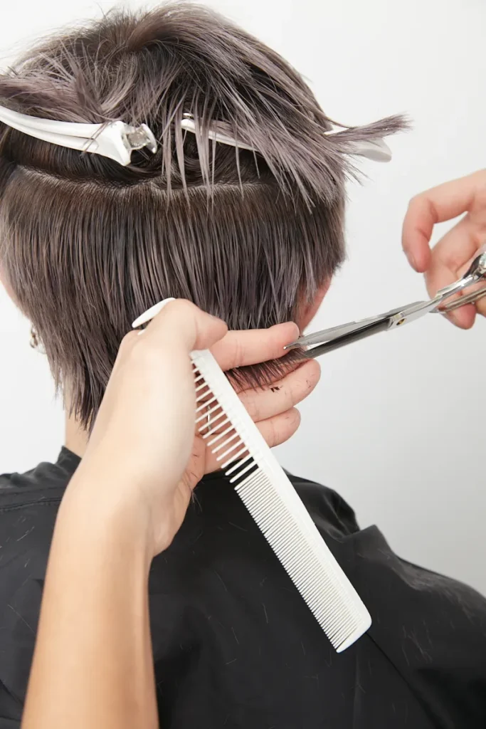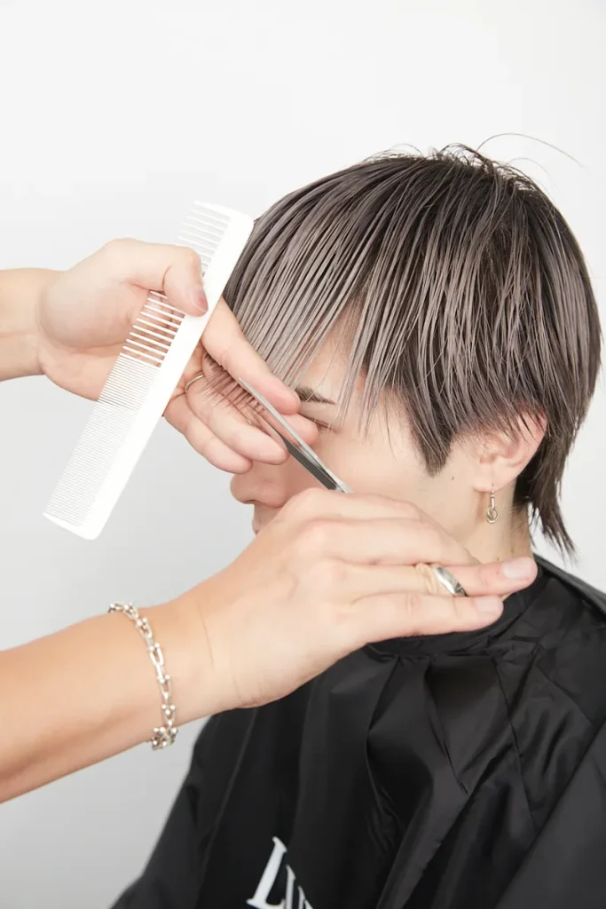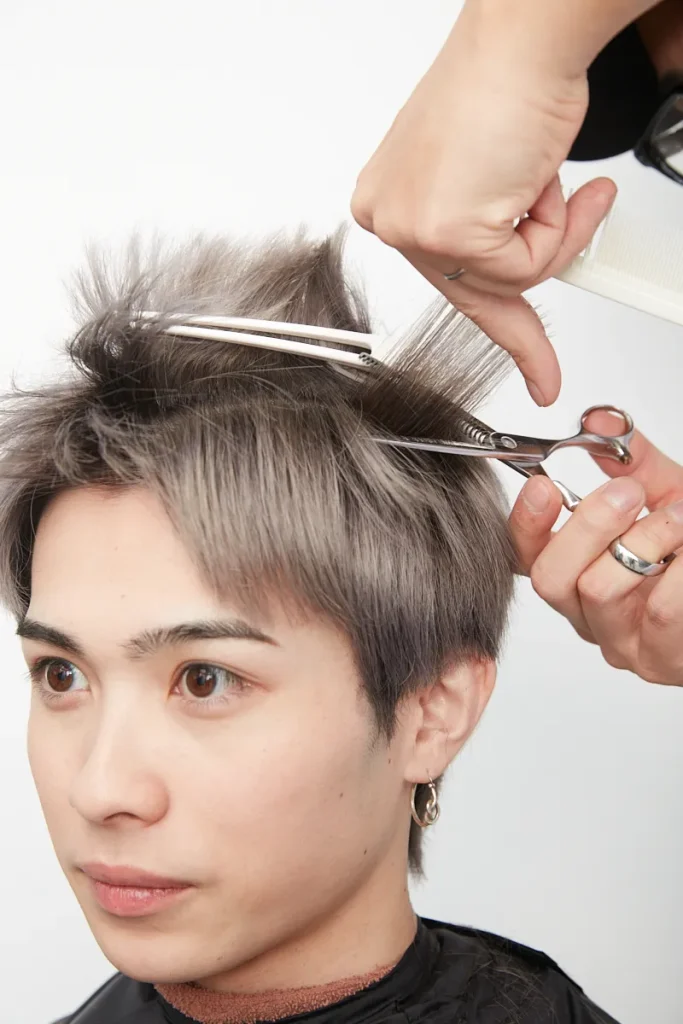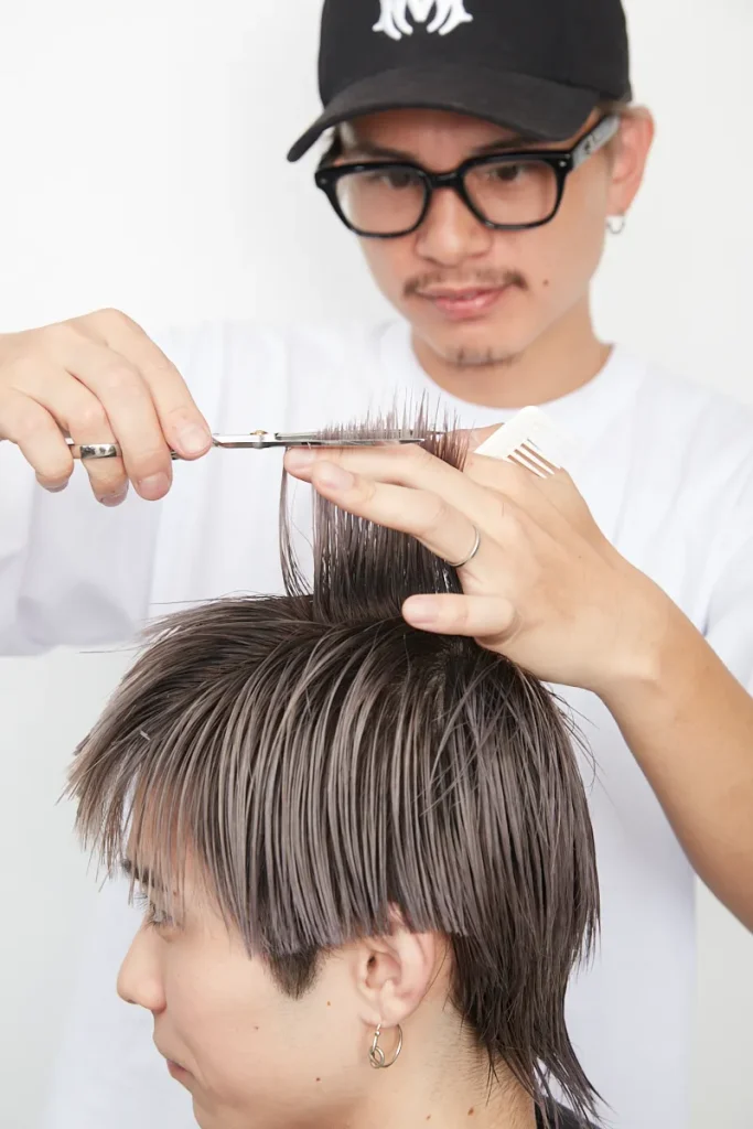 ドライカット。全体的に根元・中間・毛先にセニングを施し、細めの束感をつくる。