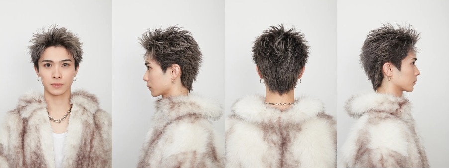 夏はスパイキーショートで短めレングスを楽しんだぶん、冬にかけて伸ばしたいニーズに応えるのが「シャドウショート」。顔まわりを長めに残してニュアンスを引き出しつつ、男の色気を表現。長くなるとそのぶんスタイリング力が問われるが、根元からのグラデーションカラーを効かせたシャドウルーツを組み合わせることで、色彩による奥行きと立体感が自然と引き出される。スパイキーショートの束感よりも軽やかで、柔らかくリバースに流れる毛流れが、やんちゃさをセーブした落ち着きと洗練された表情を演出。計算されたカットとカラーだからこそ実現する、再現性抜群のこの冬イチ推しのショートだ。