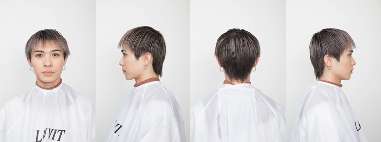 サイドは前下がりではなく並行ラインにカットすることで後ろに流しやすくなり、この毛流れによりシャドウルーツカラーがさらに際立って見えてくる。