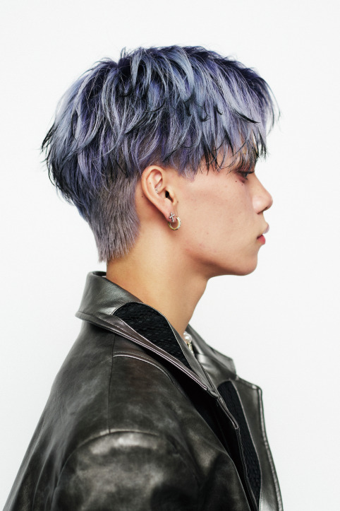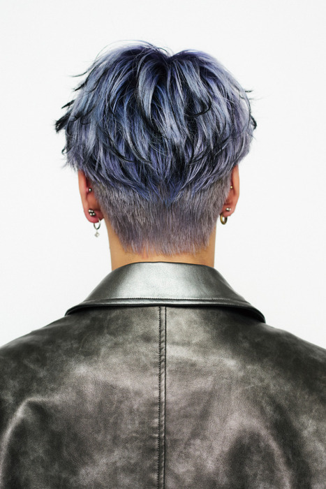 COLOR/全体をブリーチで18.5トーンまでリフトアップ。根元は7トーンの紫、毛先は10トーンの紫を薄めて塗布。刈上げ部分も毛先と同じ薬剤を塗布。水洗後、毛先にポイントで3トーンのブラックを入れる。