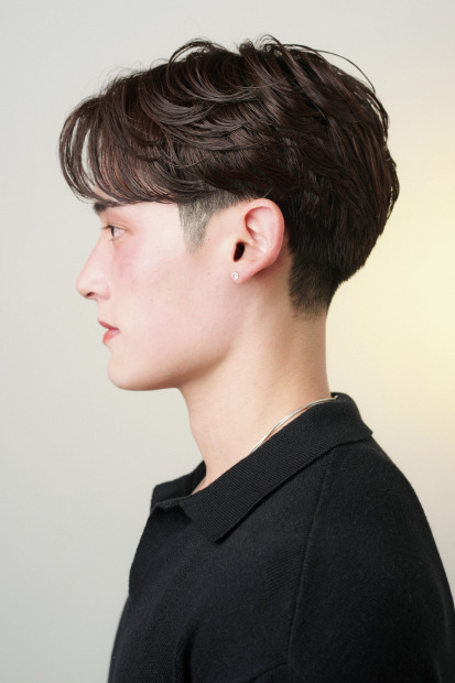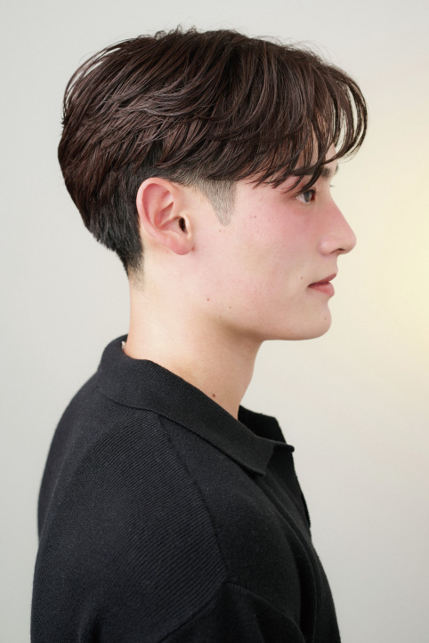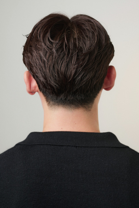 CUT/ショートレイヤーベース。アンダーは3㎜に刈上げてグラデーションにする。オーバーはトップにレイヤーを入れる。バックはグラデーションにカット。セクションごとにチョップカットとスライドカットで量感と質感を作る。