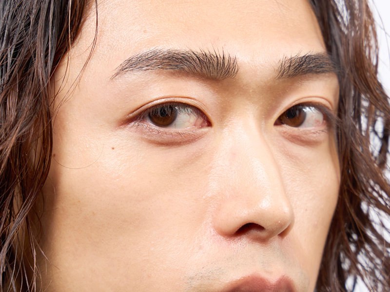 眉はリキッドタイプのペンシルですき間を自然に埋め、アイブロウマスカラで立ち上げて精悍に。アイシャドウは目の下の中間にに入れる。リップは色ムラをカバーする程度に薄く塗る。