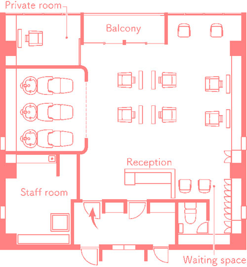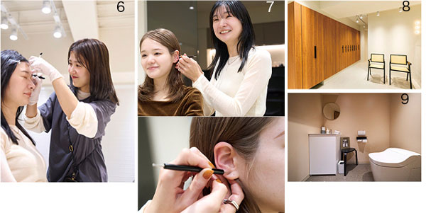 6.アイブロウの施術を担当するスタイリスト・影山夏美さん。ヘアスタイルとも関連するアイブロウのデザインを提案する。7.「耳つぼジュエリー」を担当するスタイリスト・渡部真衣さん。耳のツボを刺激することでむくみや不眠など身体の不調にアプローチしながらおしゃれを楽しめる。8.ウェイティングスペースとロッカー。9. お手洗いも広々としている。●設計/宗形巧麿(株式会社LARGO)