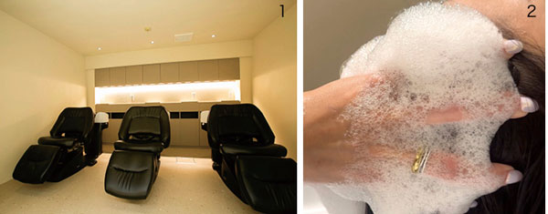 1.リラックスしやすい暗めの照明となっているシャンプー台エリア。2. 人気メニューのヘッドスパ。今後、アロマを選べるメニューを拡充予定。