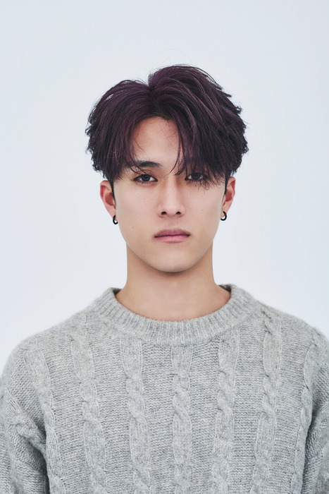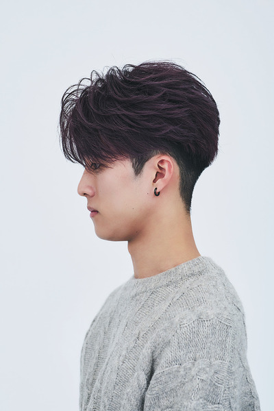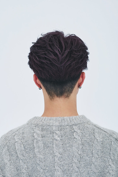 顔まわりを内に入れた狭めコンマヘアに、光で表情を変えるダークパープルのカラーをプラスしたスタイル。派手すぎず個性が出せるカラーで、落ち着いた印象に仕上がっている。黄みを抑えたベージュ系へと色落ちするので、秋冬のトーンチェンジにも最適だ。model: Nakamura Kosei