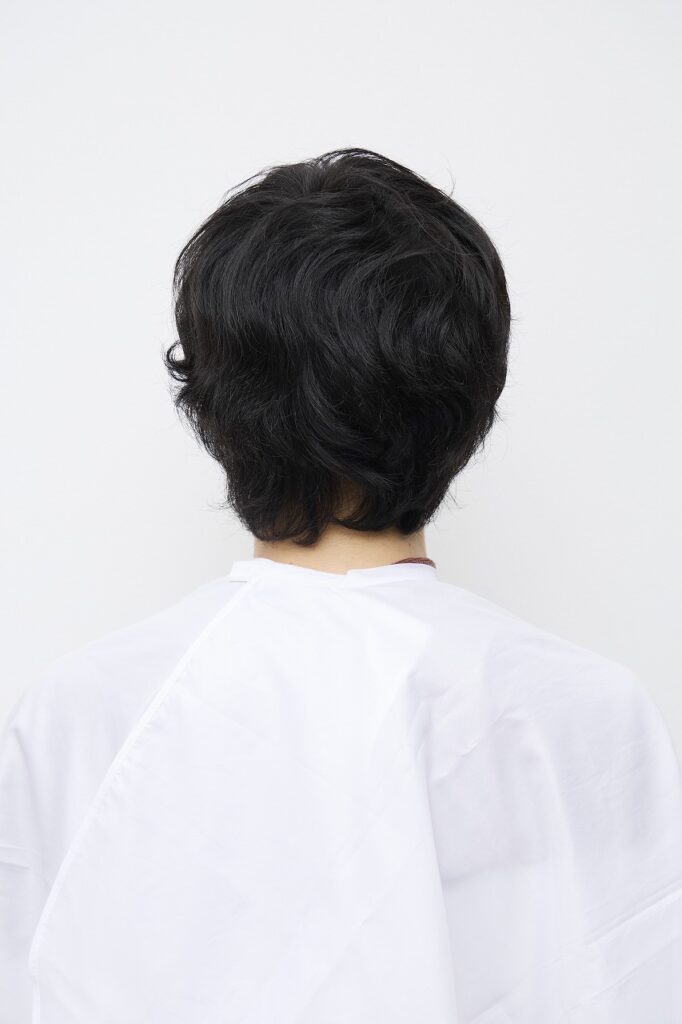 同様にしてトップからバックのレイヤー部分を順にチョップカットを行い、毛先の質感を調整する。