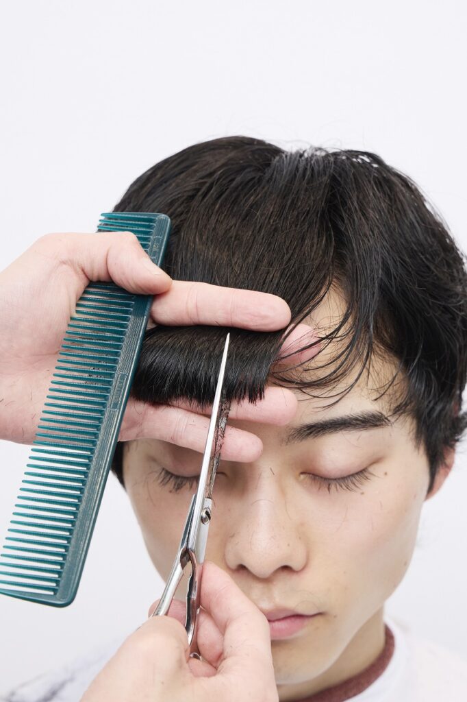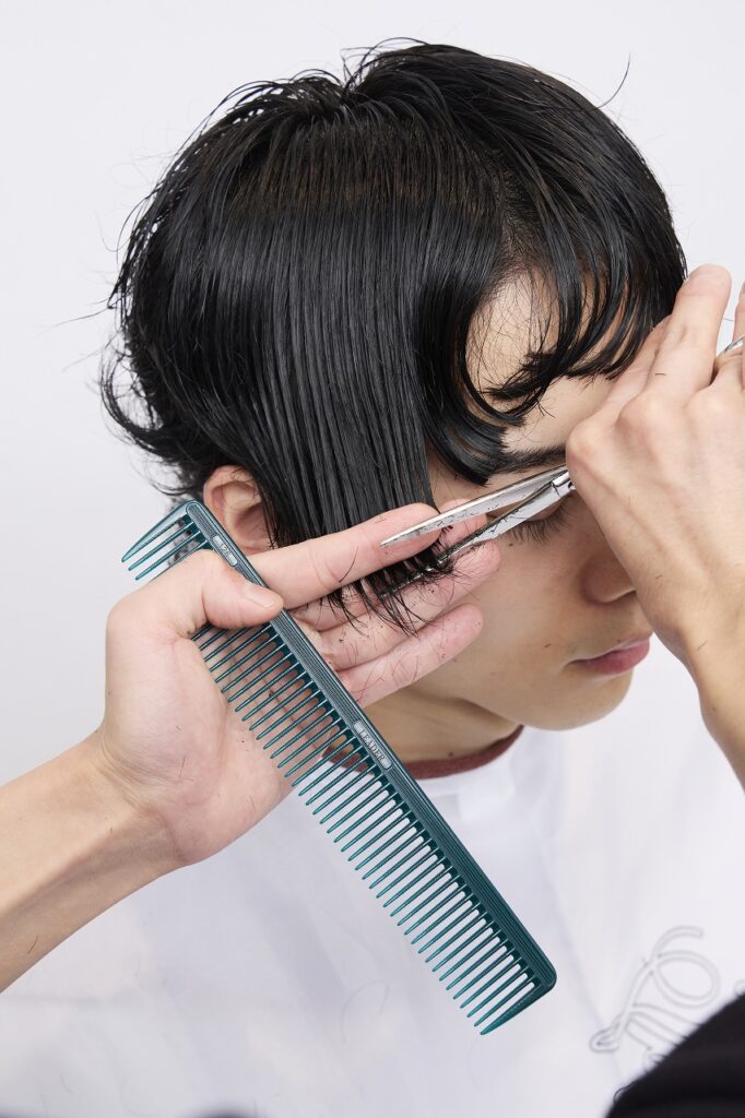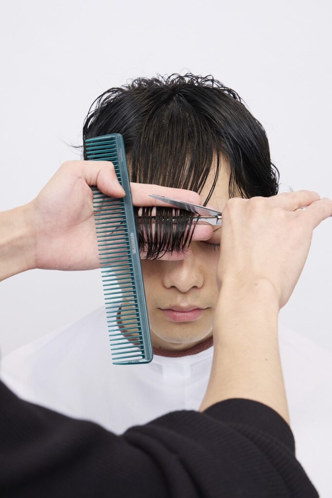 デザインのポイントとなる前髪からカット開始。後ろに流れるクセがあるので、両黒目幅でやや深めに分け取る。眉上で設定する。