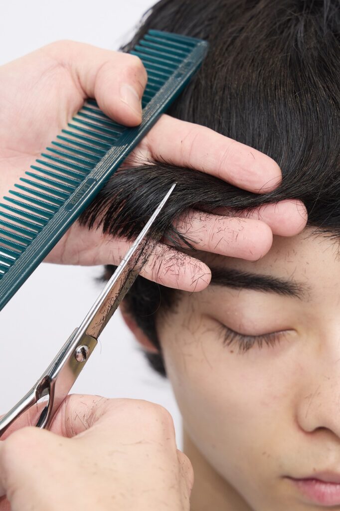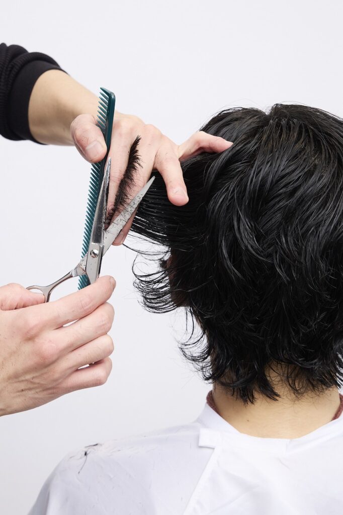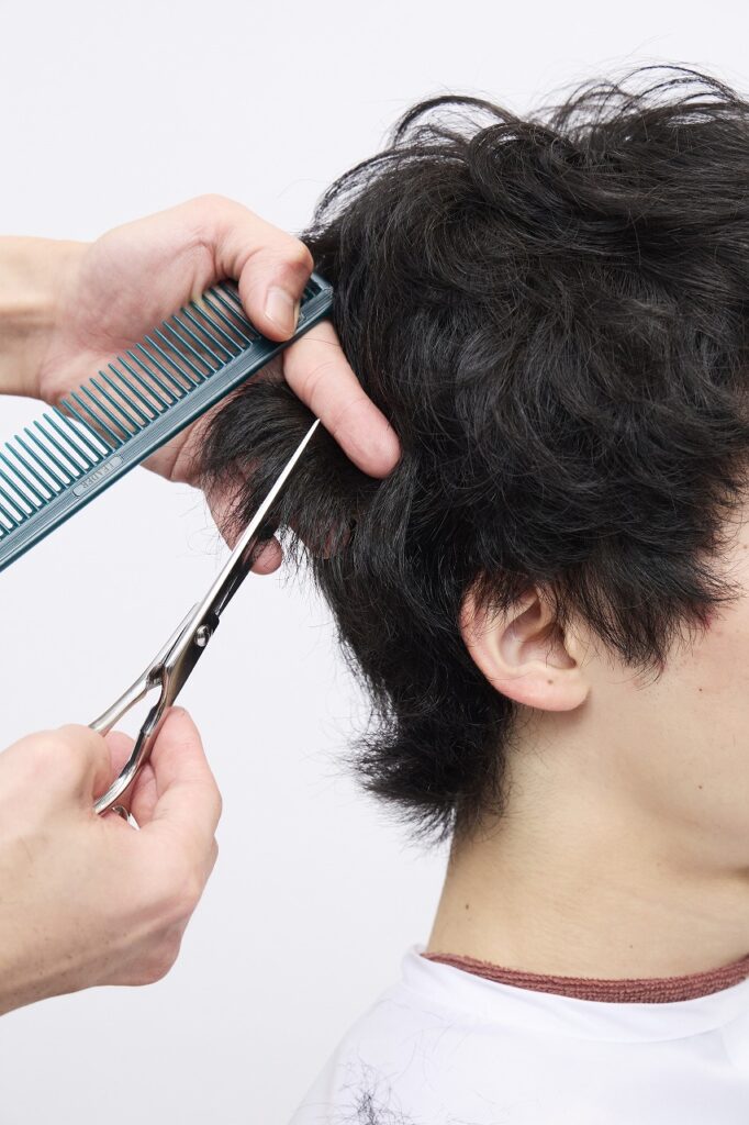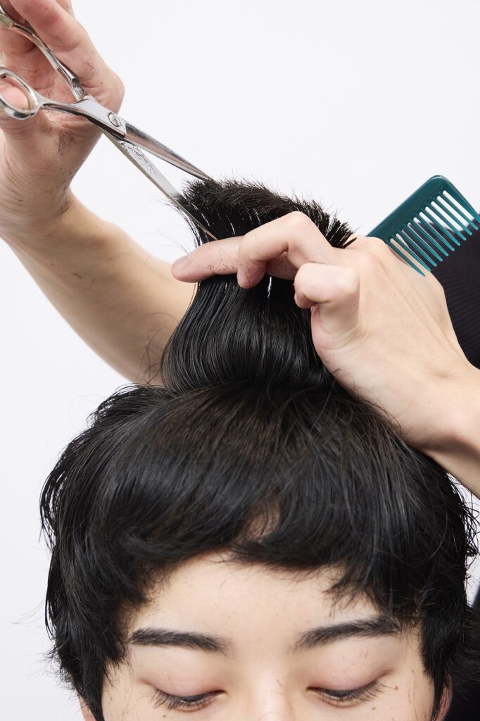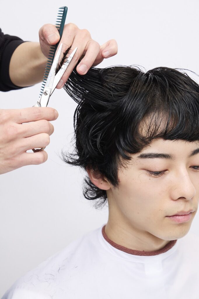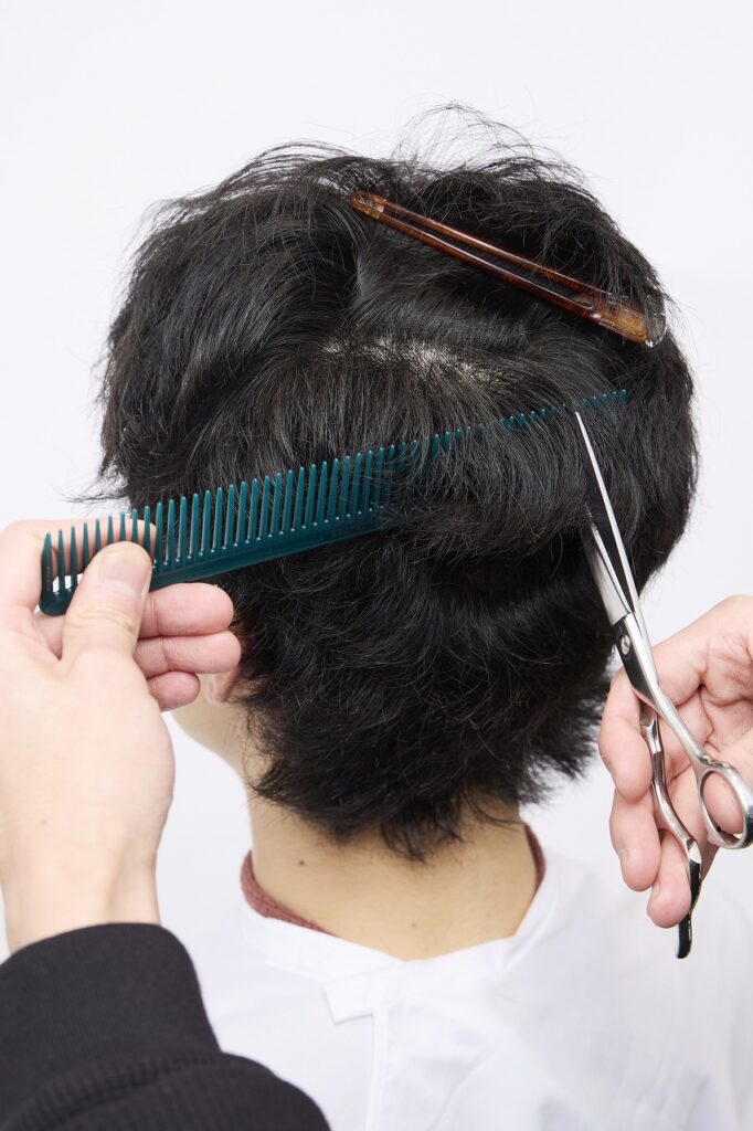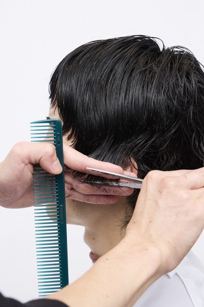 基本的に毛流れに沿ってパネルを引き出し、その毛流れに対してシザーを斜めに角度をつけて入れる。これにより抜けが生まれる。