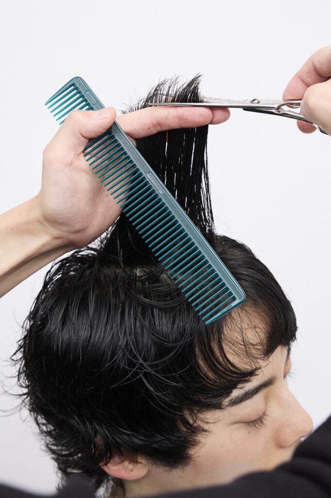 毛量の溜まりやすいミドルは、コームですくい、より深めにチョップカットを入れる。