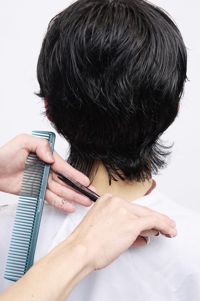えり足は、今回は長さをあまり変えず、毛先を整える程度。ブラントでばらつきをきれいにする。