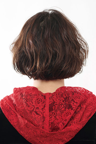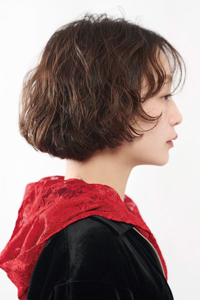 CUT/リップラインのマッシュベースのボブ。バングから顔まわりにかけてレイヤーをつなげて入れ、表面はスライドカットで軽さを引き出す。表面とアンダーのレングスは同じ。ミドルの重さを取ることで丸みをつける。PERM/えり足は15㎜で逆巻き、トップは20㎜、それ以外はカットラインに合わせて17~20㎜の平巻き。COLOR/8レベルのチェスナット。STYLING/ウェット時にオイルを付け、弱風で水気を飛ばしたら、毛先中心にバームを重ねる。