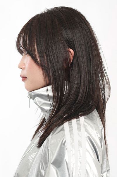 CUT/胸上5㎝の前上がりロング。顔まわりはあごラインからサイドまでレイヤーでつなげる。トップにボリューム感が出るよう、顔まわりのレイヤーをガイドに、髪表面にもレイヤーをつなげる。前髪は目にかかるくらいのシースルーバングに整えて。COLOR/ツヤ感たっぷりに見せる7レベルのラベンダーグレージュ。STYLING/ストレートアイロンで全体を内に巻いたら、オイルをなじませて軽さと動きを引き出す。前髪はコーミングして細めの束感をつくる。