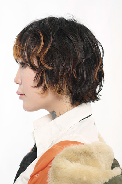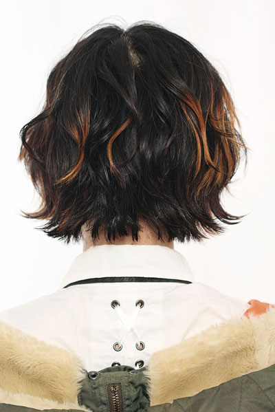 「写真映えするつくり込みヘアに少し疲れてきた人へ、クセ毛やパーマを意識したラフなスタイルをご提案。オレンジのハイライトが、巻いた毛先の動きを強調してくれるので、レイヤーで軽く動きやすくした毛先をあえてアイロンで巻き込みすぎないのがポイント。もみあげやえり足、前髪、トップ表面にハイライトを数本入れることで、360度どこから見てもカッコいいデザインになります」