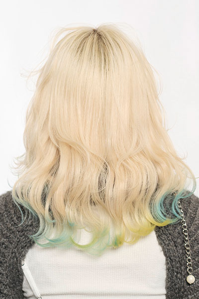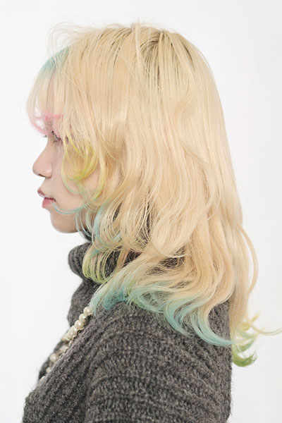 CUT/鎖骨下のミディアムベース。顔まわりはフロント近くからレイヤーを。毛先にかけてレイヤーでつなげてカットする。目尻、ほお、あごの3カ所にポイントをおいて切ることで、デザインカラーがしやすくなる。COLOR/抜きっぱなしのブリーチカラーがベース。ペールトーンのピンク、水色、オレンジ、黄緑、黄色を、前髪の毛先やすそにバランスよく配置。STYLING/32㎜のアイロンで毛先を外ハネに。オイルとバームを1:1で混ぜ、髪に動きをつける。