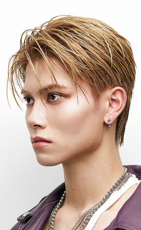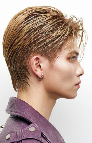 CUT/急角度な前下がりセンターパートのグラデーション。耳まわりをタイトにし鋭い印象に。えり足はレイヤーで締め、硬さを残すため毛先は重めに整える。