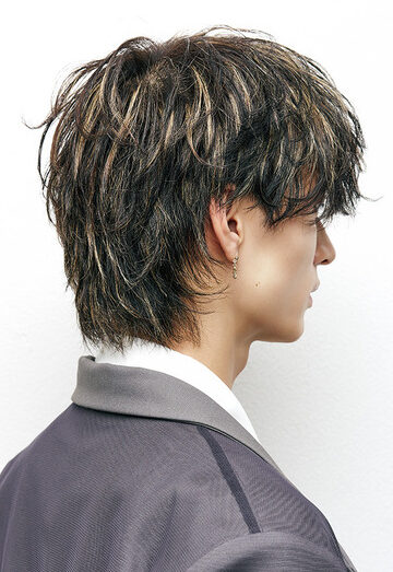 CUT/グラデベースのマッシュウルフ。顔まわりはレイヤーとグラデでラウンドぎみに。前髪は重めのグラデ、トップはレイヤー。バックアンダーは1線目のみグラデで締め、他はレイヤーでつなぐ。