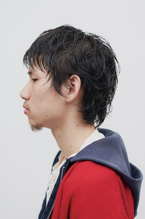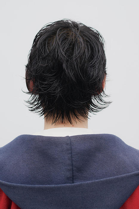 UKロックから着想を得た、ナードな雰囲気が漂うスタイル。もみあげの長さや質感、重めのバックセクションにこだわった。野暮ったくなりすぎないよう、シルエットをタイトにすることでニットにもフィット。音楽カルチャーや独特の空気感を好む人にピッタリなデザインに。model: Yamahaku Koki