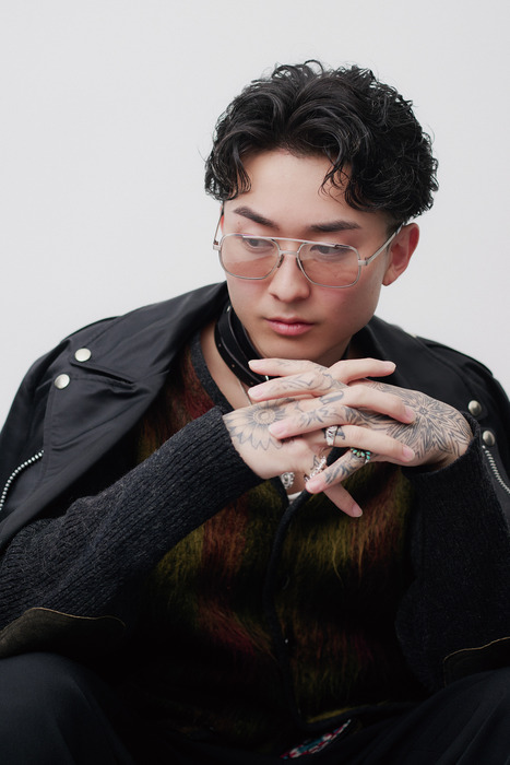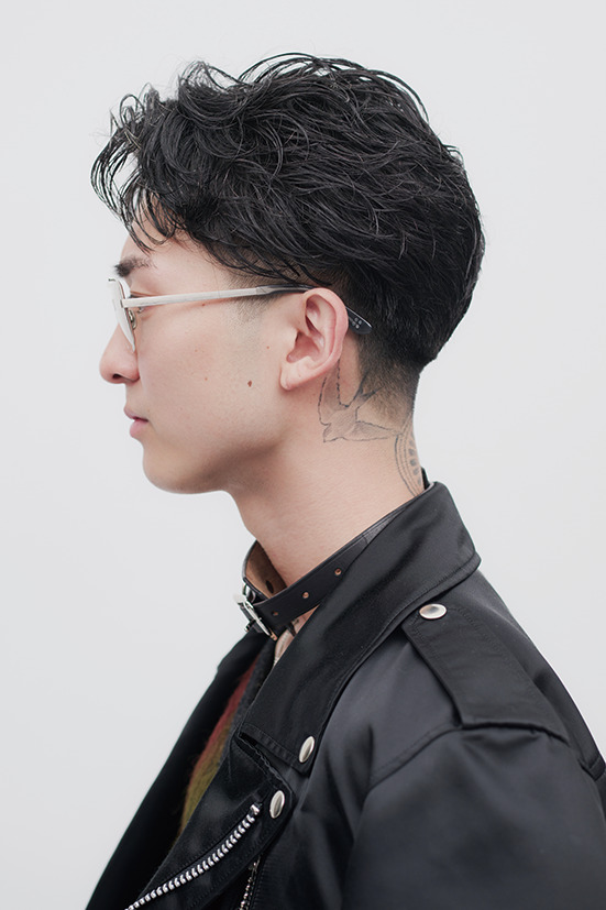 大人の色気を備えたセンターパートスタイル。ルーズなニュアンスパーマで抜け感を出しつつ、締めるところはしっかりコンパクトにして、ボリュームが出やすいニットにフィット。柔らかな質感に振り切らずハードな印象に仕上げることで、ツヤっぽさと男の色気をプラスした。model: Yamada Ryuki