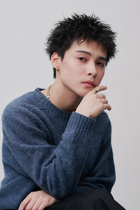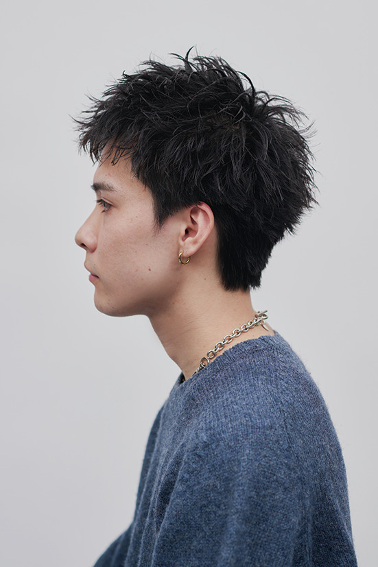トレンドの、長めスパイキーショートをベースに、ピンパーマの動きをプラスしたアクティブショート。パーマで外ハネを効かせた動く毛束で、スタイリングの再現性も高い設計に。男性的な印象の中にも、ほのかな「甘さ」を残し、ニットの装いとの相性もよく仕上げた。model: Shibata Rui