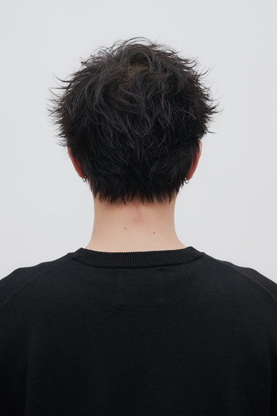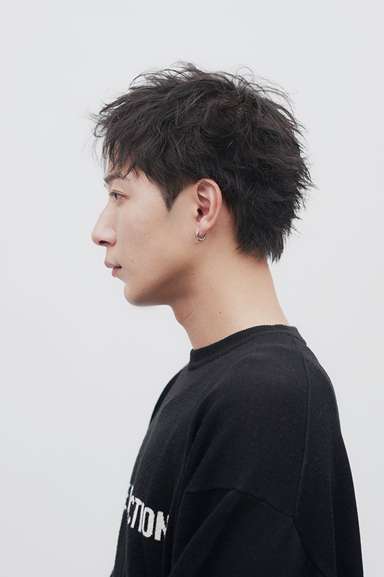 CUT/ショートレイヤーベース。前髪は眉に少しかかるくらいの長さに設定してカット。サイドとバックは刈上げず、シザーで整えるぐらいの長さにカット。トップはやや短めに設定し、セットした際に遊びが出るようにする。