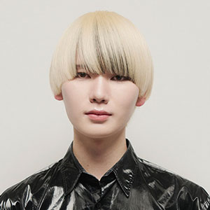 CUT/ベースはウルフレイヤー。レイヤーがズレるように設計しているので、髪が同じ位置で重なることなく、色が均等に露出するようにしている。COLOR/ブリーチリタッチ後、ホワイトをオン。レイヤーの中間~毛先にペールブルー、毛先にブラックを。PERM/なし STYLING/32㎜アイロンで全体を波巻き、顔まわりは内巻きに、表面はスパイラルに。ツヤの出るバームを髪全体になじませ、毛束を整える。