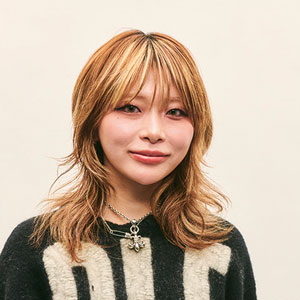 ダメージがひどく毛先がパサパサだったので、ダメージに合わせてローレイヤーを。Perm/なし。Color/17レベルのピンク。Styling/32㎜アイロンを使い、ウェーブをつくりすぎないようにラフなミックス巻きに。オイルで束感を出し、ヘアスプレーを。その際、スタイリング剤を付けすぎると重くなってしまうので、適度な軽さを残すよう心がける。