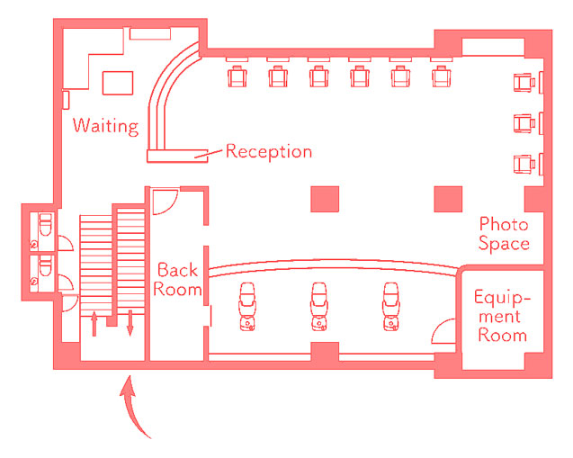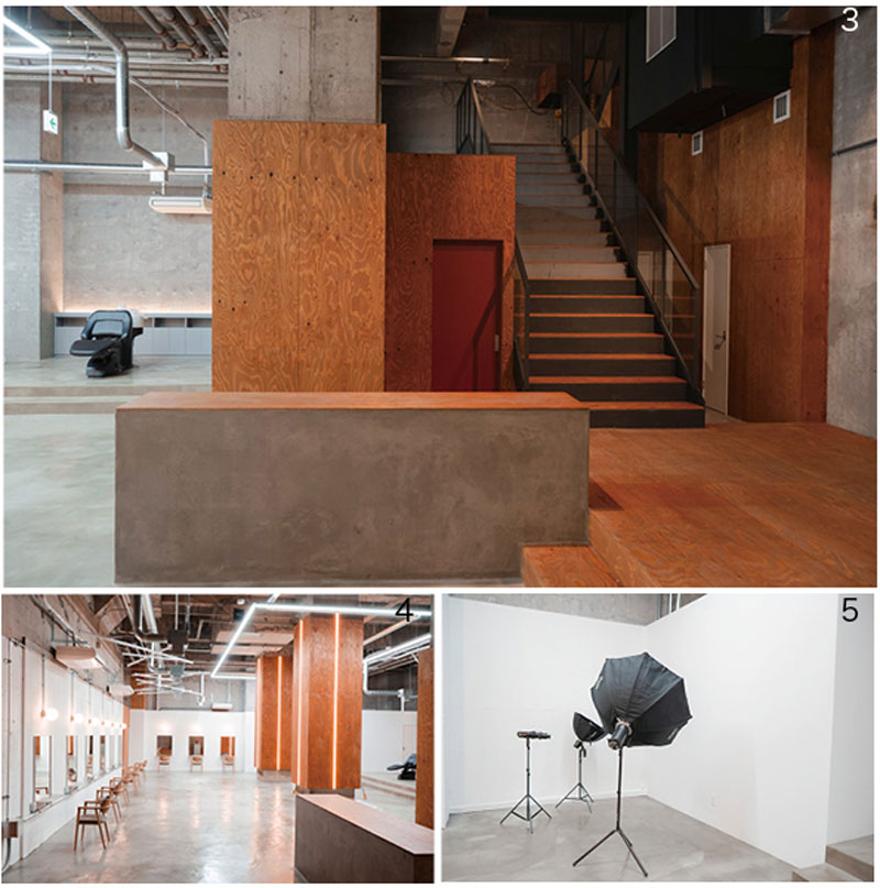 3.階段を降りてすぐにレセプション。カウンター後ろにドアがあり、クロークも兼ねるバックルームに通じる。4.天井の高い広々としたフロア。巨大な柱2本がセンターにあるが、お客さまの視界を遮る役に立っている。また、将来的にはここにセット面を増設することも可能。5.フロア奥には撮影スペースを用意。その横にある機械室を用具入れはもちろん、撮影機材収納としても利用可能。