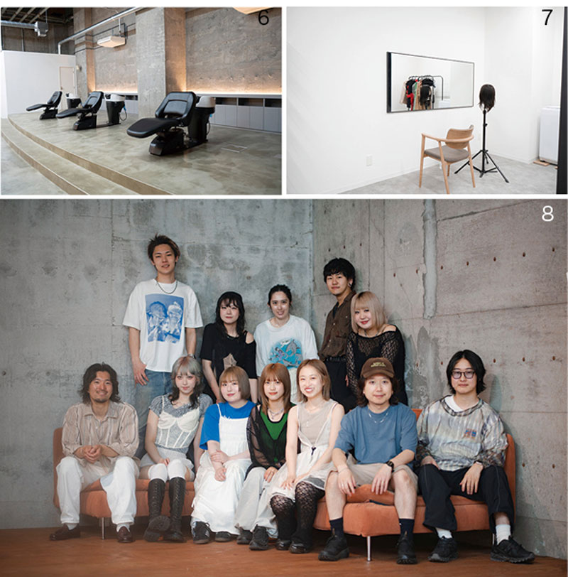 6.シャンプー台は3台。将来的に増設を予定している。7.バックルームにはセット面を設置。営業中でも練習することができる。8.『シカ』全スタッフでお客さま対応を。上下階で担当を分けずに、チーム力を生かしていく予定。設計/浄土ひかる(キイロ)