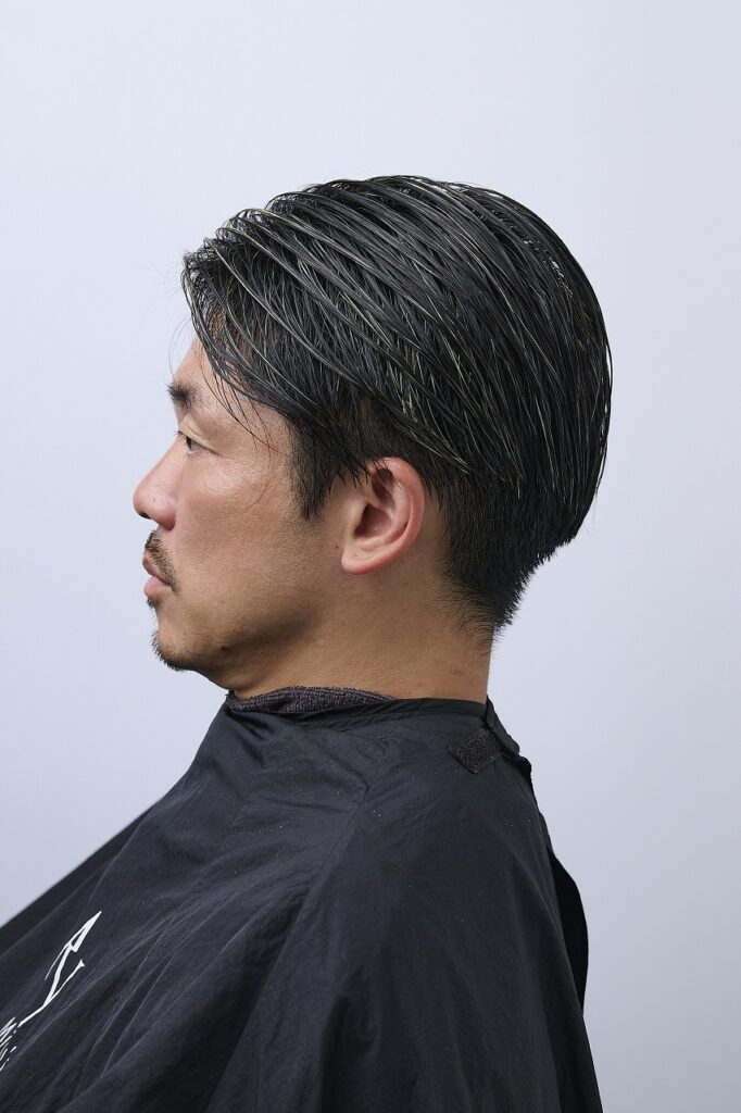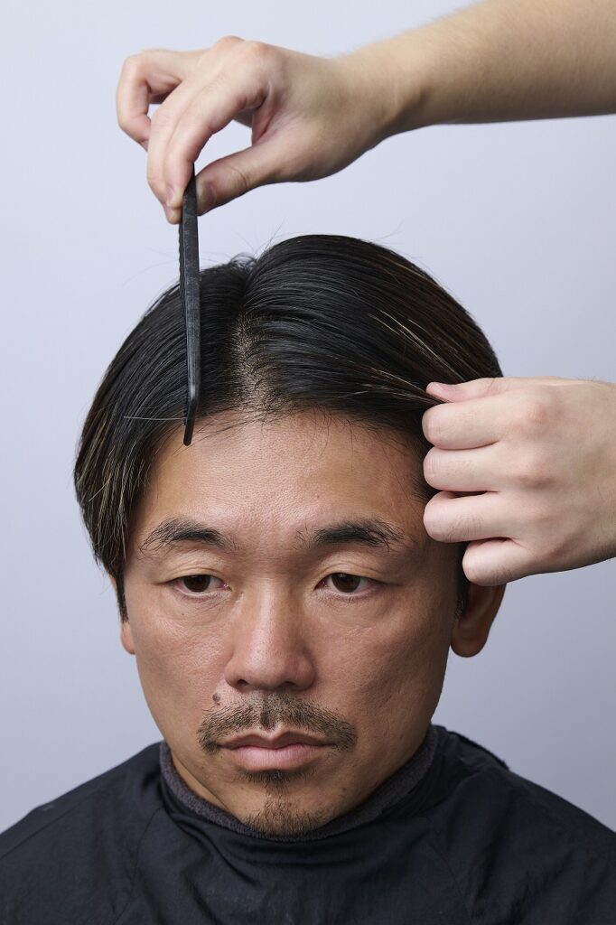 メッシュキャップを被せる前に仕上がりのイメージに合わせて髪を整える。今回はやや右にパートをつけた毛流れスタイルに。