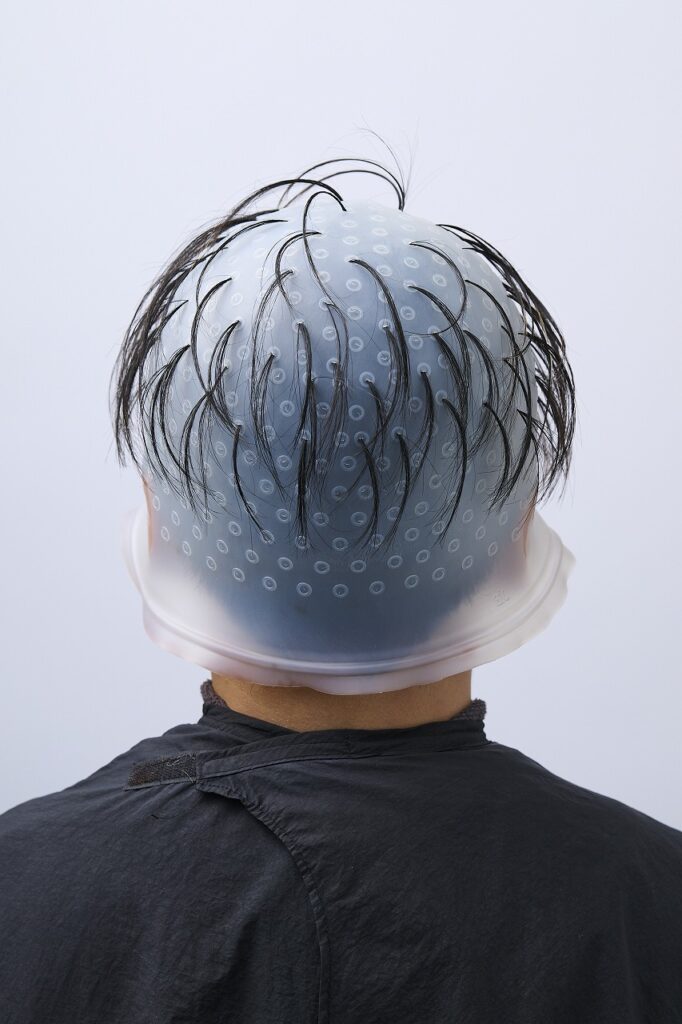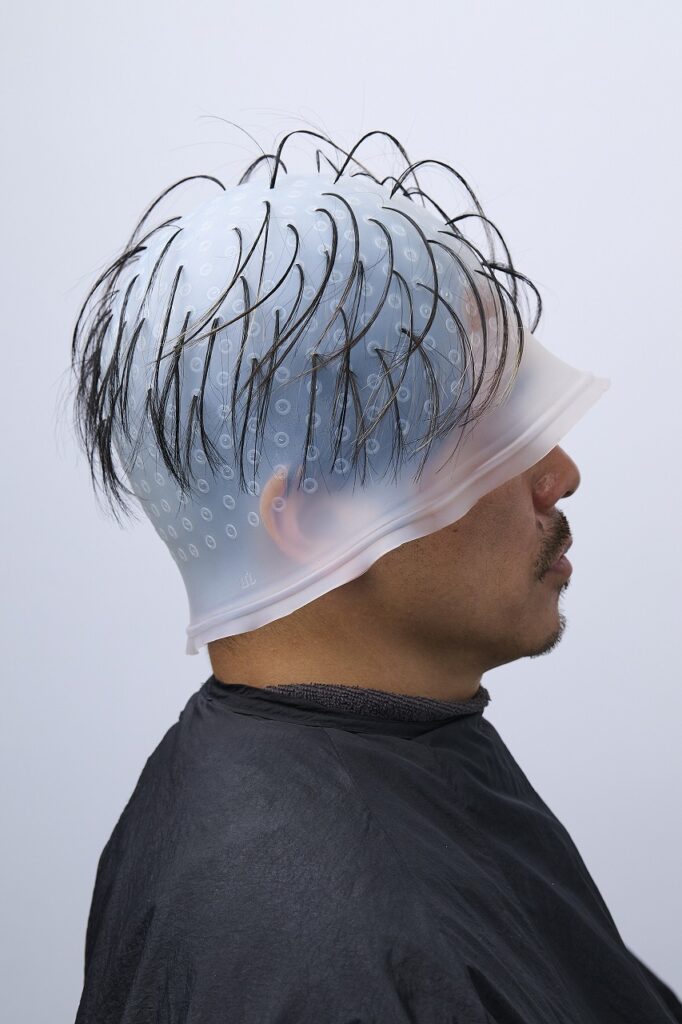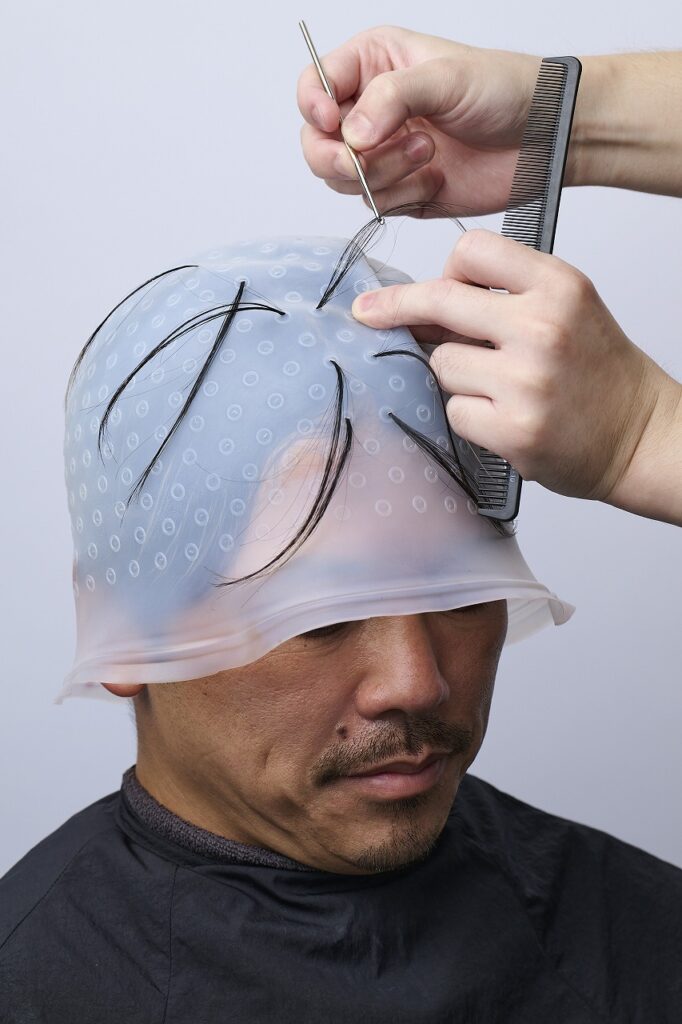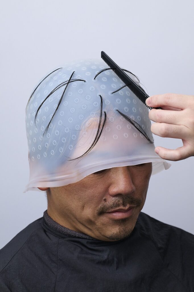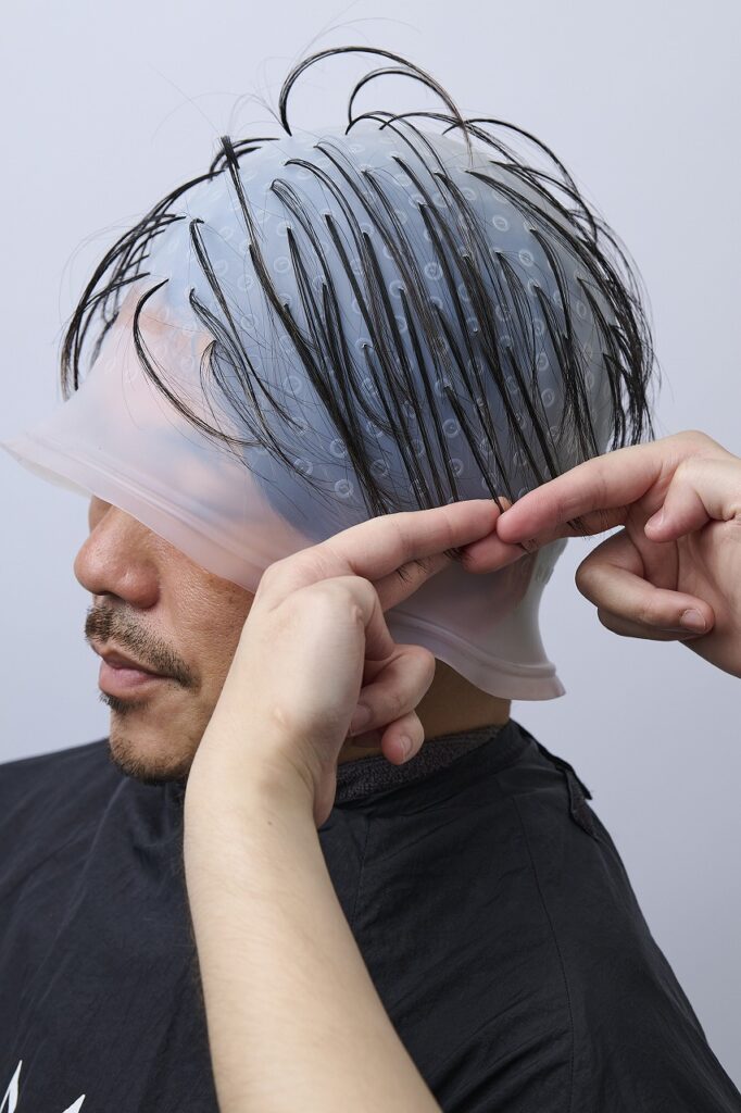 菊池 (メッシュキャップをかぶって) 久しぶりだなあ、これ。キャップをかぶるので地肌に薬剤が付かず、安心ですね。
