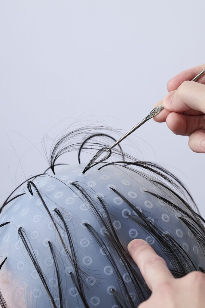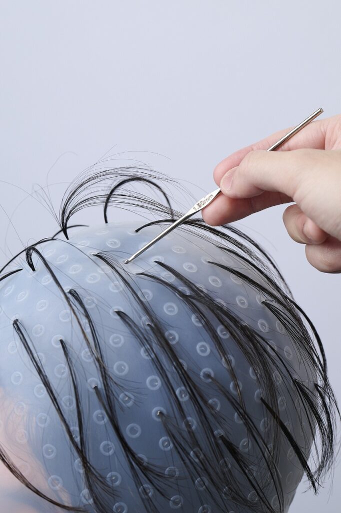 引き出し終えたら毛先の分量、厚みをチェック。メッシュキャップのいいところはこの段階でさらに分量を増やしたり、減らしたりするなど調整できること。