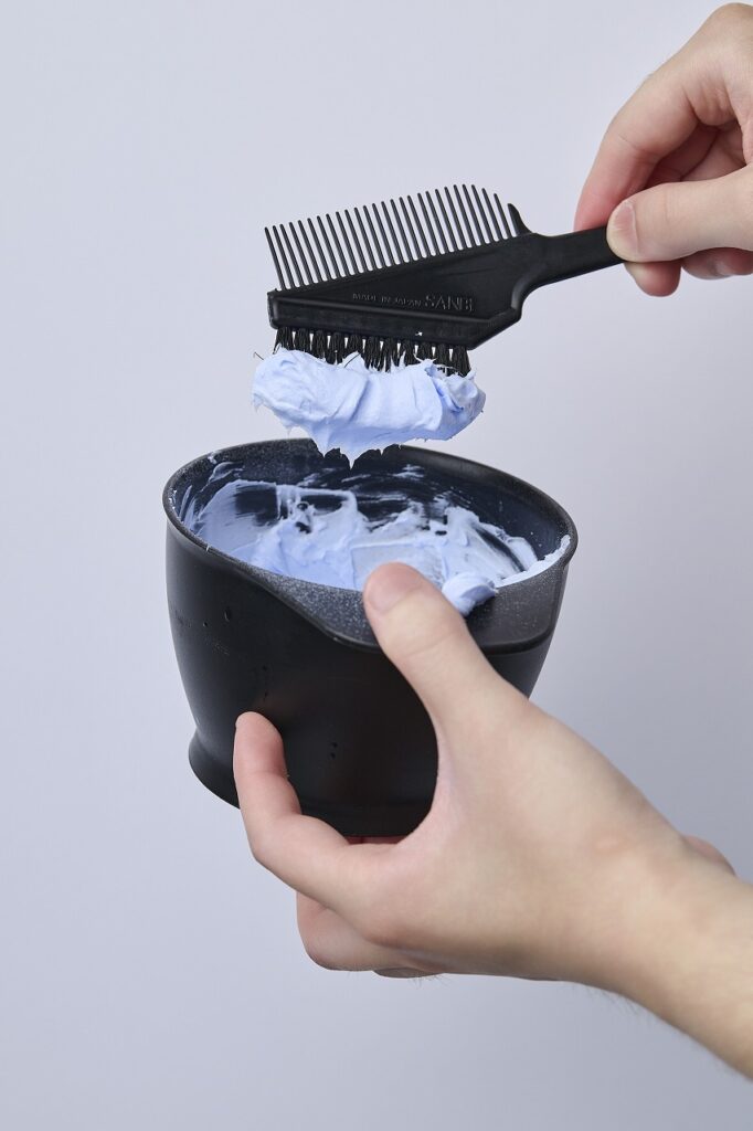 ブリーチ剤は粘度をやや固めにして液ダレを防ぐ。(穴から薬剤が入ってしまうのをセーブ)。2剤のミックス量は粘度を見ながら。グレイヘアのリタッチ時くらいの固さを目安にする。