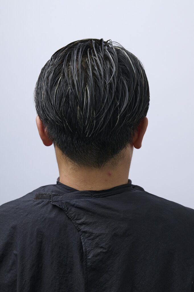 ホワイトがきれいに映える「白髪メッシュ」が完成。前髪の立ち上がり、サイドの毛流れにメッシュが連動。スタイルを際立てて立体感もアップ。