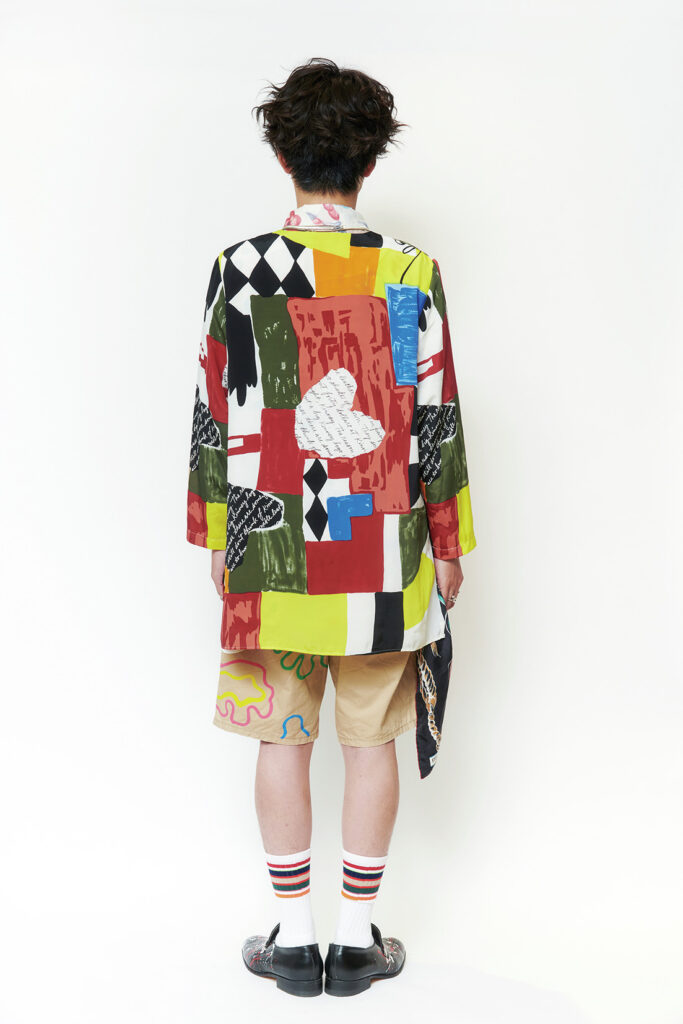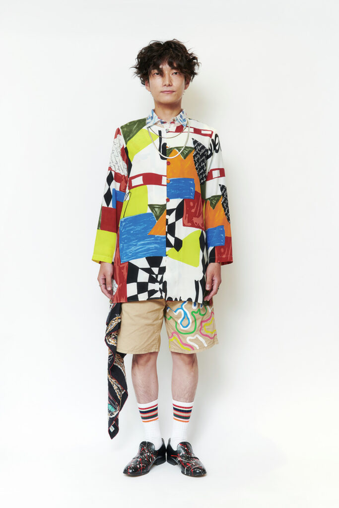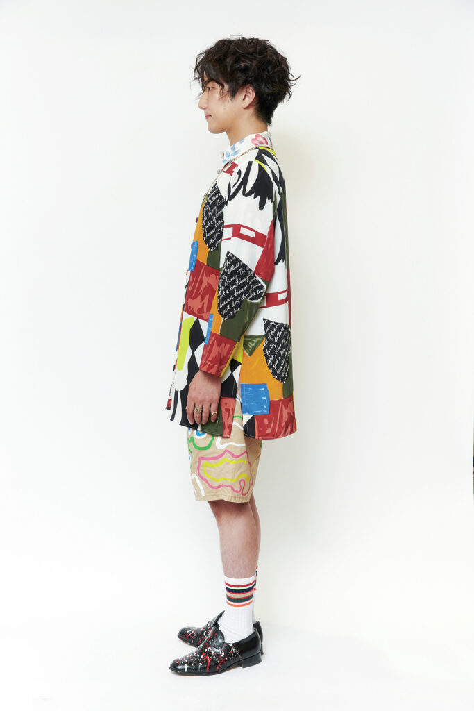 コート/¥17,800、シャツ/¥11,000、中に着たシャツ/¥6,600、ショートパンツ/¥8,800、シューズ/¥14,800、ネックレス(短)/¥6,600、ネックレス(長)/¥7,480(すべてTOKI CLOTHING STORE)