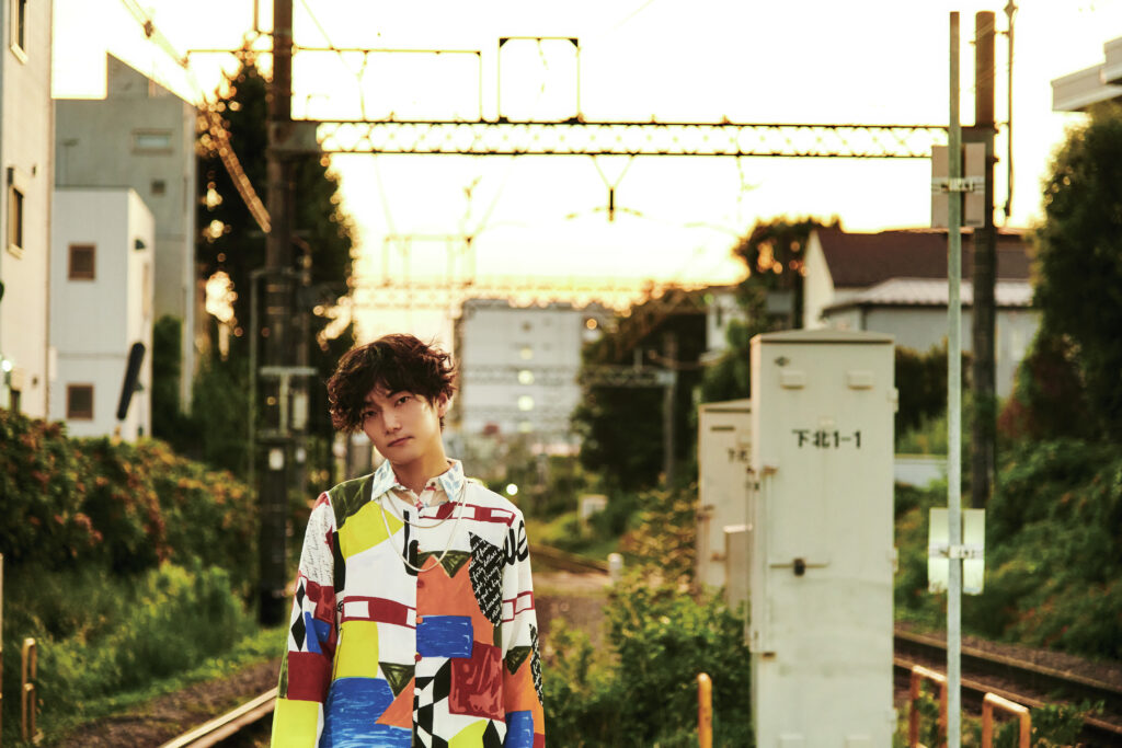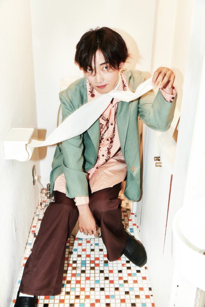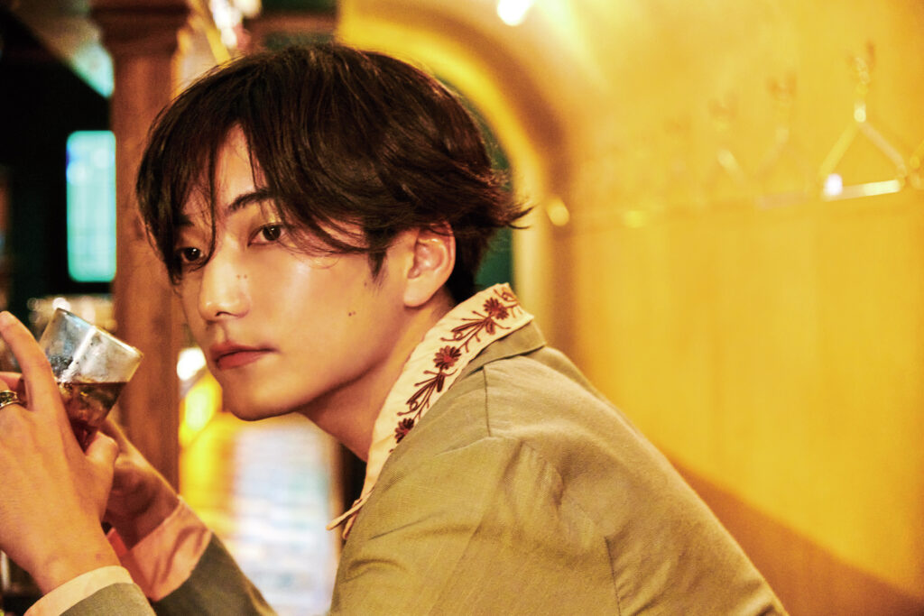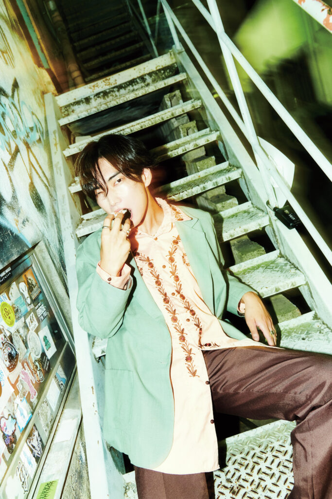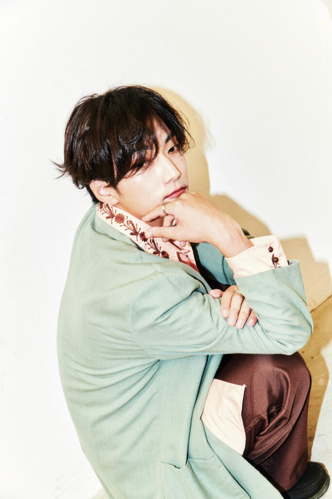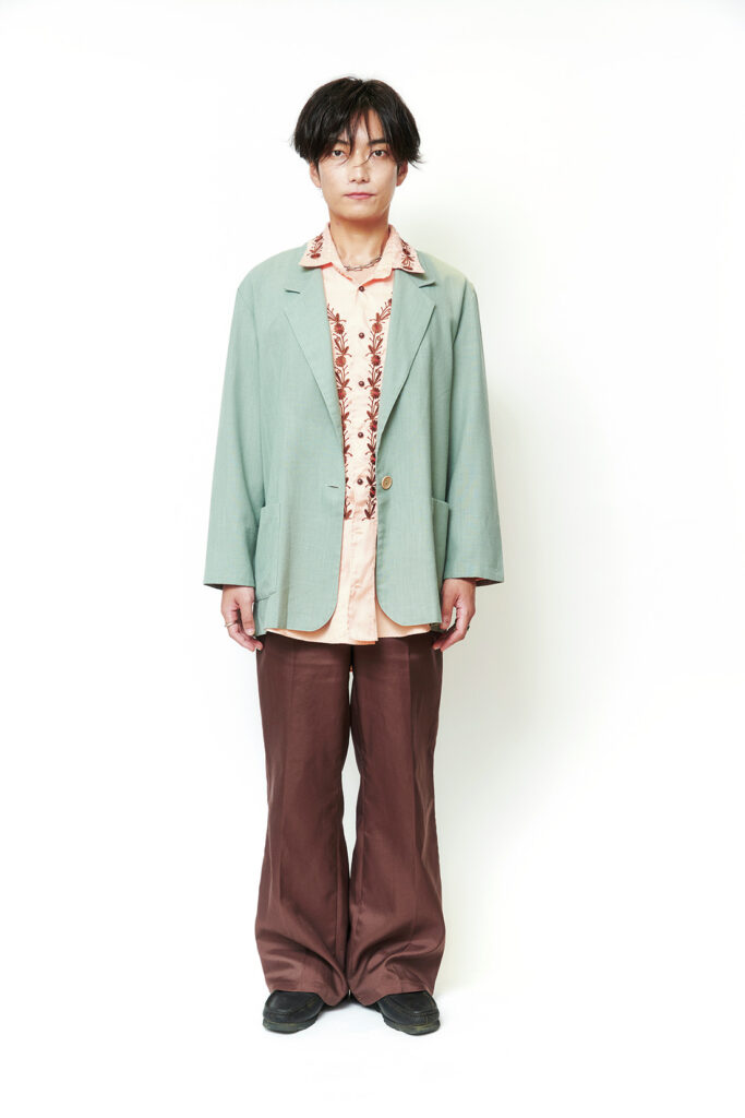 ナチュラルな仕上げのセンターパートとジャケット、シャツ、パンツの王道スタイル。だからこそ、さりげなく作ったハネ感や毛流れ、ファッションの色使いやシルエットのディテールなど、ドキッとさせるポイントに目が吸い寄せられる。