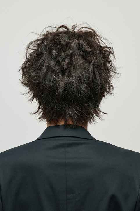 CUT/ショートレイヤーベース。フロントは前方に引き出してマッシュにカット。つむじまわりのトップは独立したレイヤーを入れる。えり足もレイヤーを入れ、正面から見えるようにする。