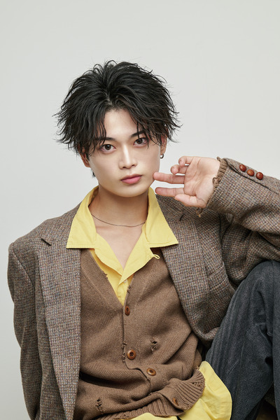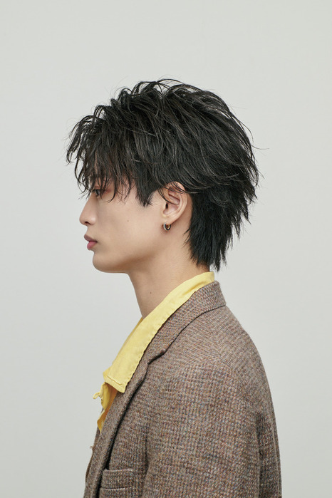 流行りのフェザーショートに無造作パーマをかけ合わせたマッシュウルフスタイル。顔まわりはリバースに流れる毛流れスタイルにし、全体はツイストパーマをミックスした躍動感のあるデザインに落とし込んだ。秋コーデにもハマるゆるふわ感と、ラクチンスタイリングが魅力。model: Ito Tsubasa