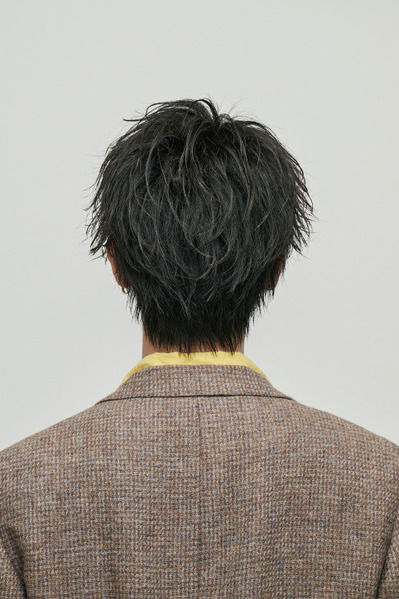CUT/ショートレイヤーベース。前髪は目にかかるぐらいに設定し、顔まわりをマッシュラインでラウンドカット。サイドは前下がりにカット。えり足は長めに残し、レイヤーを入れてくびれ感のあるウルフ調に。トップはこぶし1.5個分でアウトラインをカットする。
