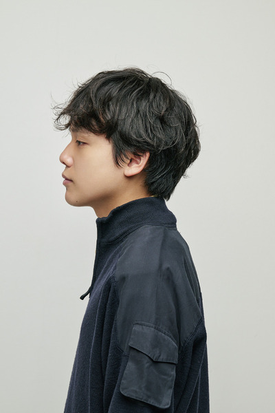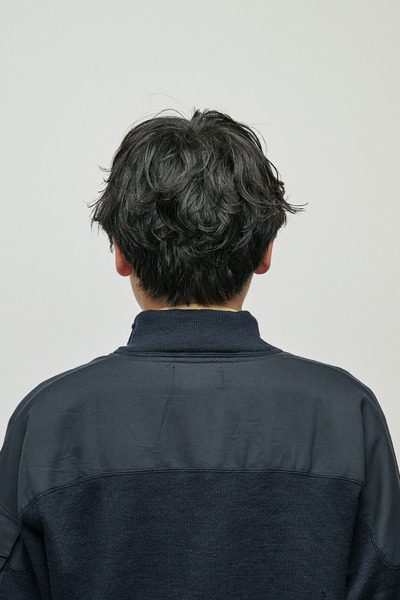 CUT/ショートレイヤーベース。ハチ下でブロッキングしてツーセクションに分ける。アンダーはえり足ともみあげに長さを残し、パーマ後にレザーで整える。オーバーは目にかかる長さに設定し、角を落とすぐらいにレイヤーを入れてグラデーションを作る。ドライ後、毛先を間引いて質感を作る。