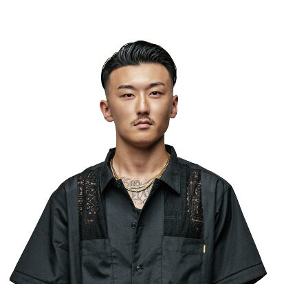 CUT/ショートレイヤーベース。ツーセクションに分け、アンダーは刈上げてテーパーフェードに。オーバーはバックをグラデーションにカットしてアウトラインを設定。フロントから順にモヒカンラインを作って、放射状にバックからレイヤーでつなげる。トップはボックスシルエットぎみにする。