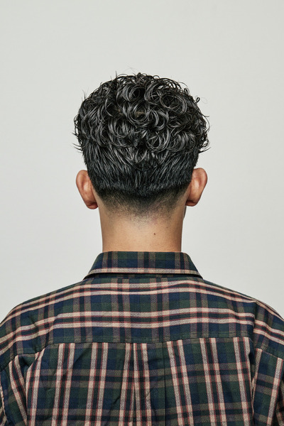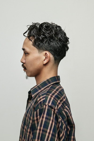 クラシックとトレンドを融合したテーパーフェードスタイル。バーバースタイル初心者でも挑戦しやすいパーマの強さとフェードのバランスがポイント。刈上げ位置を低くしすぎないことで、上にかぶさるウェービーな毛束がより浮き彫りになり、クラシックな男くさい色気が漂う。model: Shiga Hayato