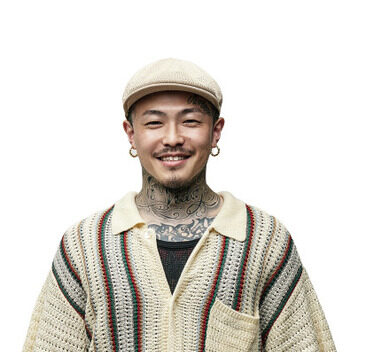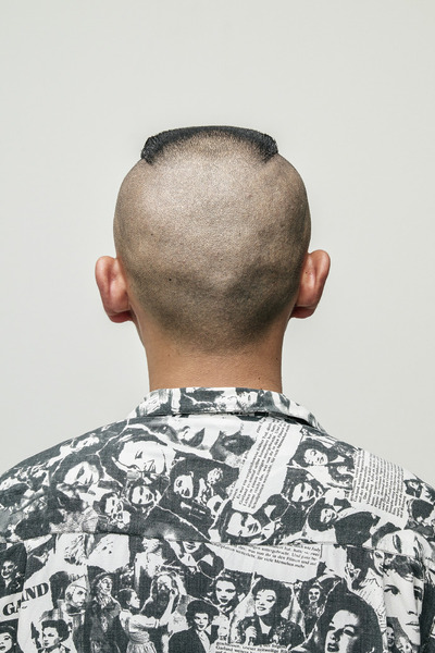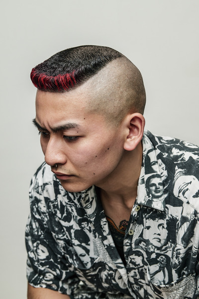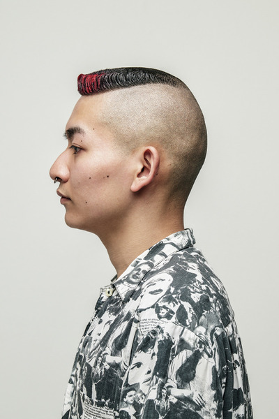 サイコビリー音楽から生まれたパンクなサイコスタイルと、アメリカの先住民族「モホーク族」の髪型から生まれたモホークスタイルをミックスして、トップをフラットにしたハイフェードスタイル。アクセントのアイロンパーマとカラー、そして硬派なスクエアシルエットが魅力。model: Kagaya Eita