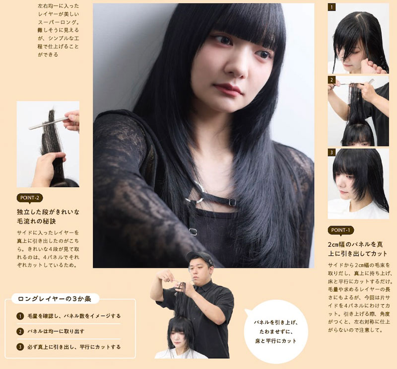 「顔まわりからきれいに入った、スーパーロングのレイヤースタイル、かっこいいですよね。このスタイルは、左右対称にレイヤーを入れるのがポイント。そのためにはていねいにパネルを引き出すことが重要になります。サイド2㎝ほどのパネルを左右対称にカット。このとき、真っ直ぐ真上に引き出すこと。今回のモデルさんはスーパーロングなので、髪を真上に引き出すのが難しいのですが、パネルをたゆませるとレイヤーがズレてしまうので、必ず真っ直ぐ上に引き出してください」