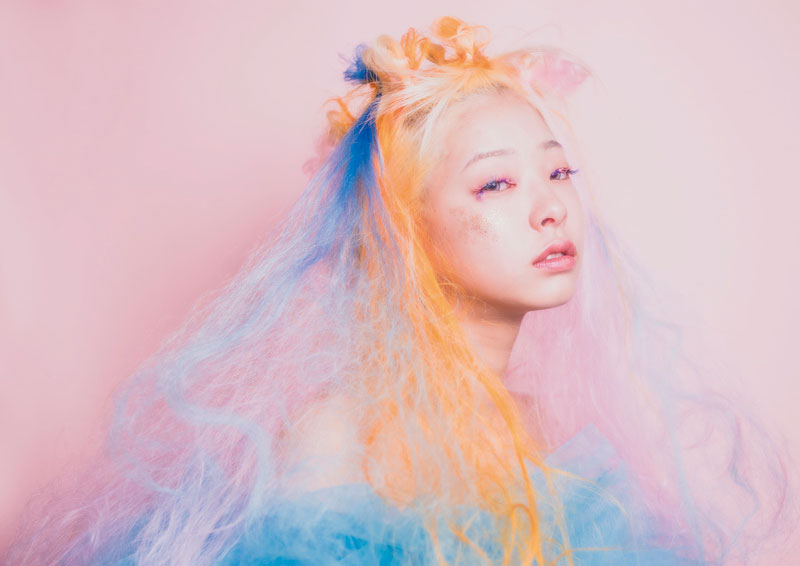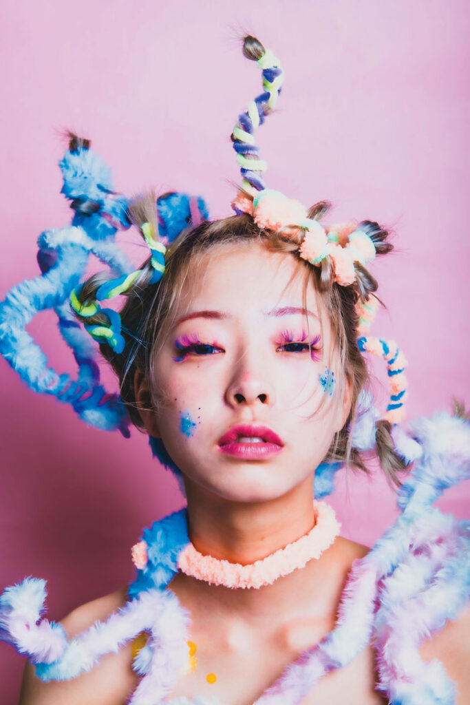 「チュールのようなふわっと軽さを感じる質感をウィッグでつくりました。ウィッグの毛束を割いて、ふわふわした質感をつくり、トップは毛束で輪をつくって編み込んでいます。その際、ビビッドとパステルのふたつのカラーをなじみすぎないようにバランス良く配置し、モデルさんの柔らかい雰囲気に溶け込むように仕上げ、パステルの世界観を表現しました。クリエイティブを始めた頃は、人のマネをよくしていましたが、いろんな人のマネをするうちに自分のつくりたいものが明確に。今は、ポジティブな印象のヘアデザインをよくつくっています」